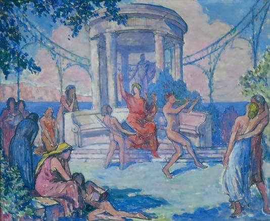 Scène de fête antique autour d'une rotonde