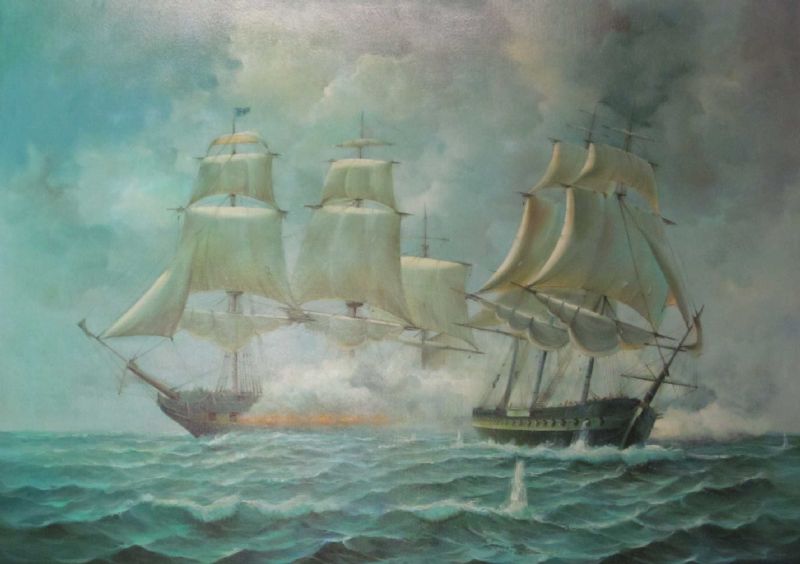 Marine scene depicting two ships in battle