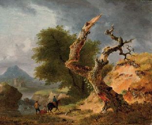 | A mountainous landscape with figures by a stream near a dead tree | |