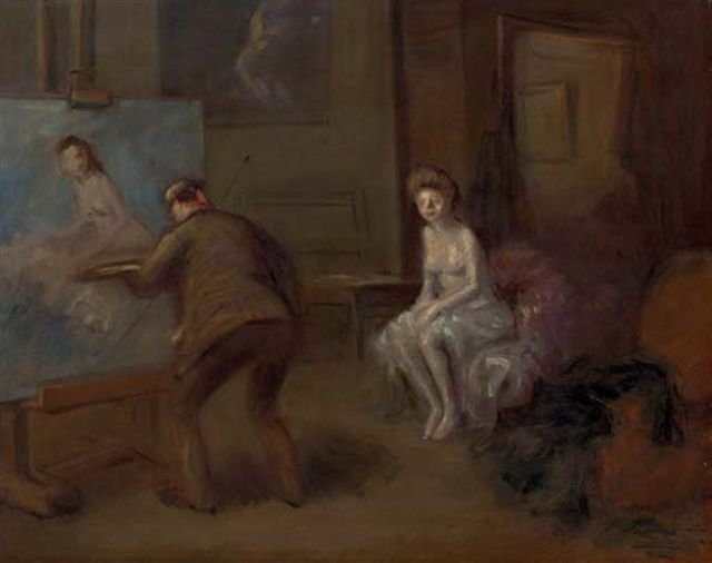 Peintre peignant jeune femme en blanc