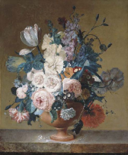 | Roses, tulips, peonies, stocks, carnations, poppies and other flowers in a terracotta vase on a marble ledge | |