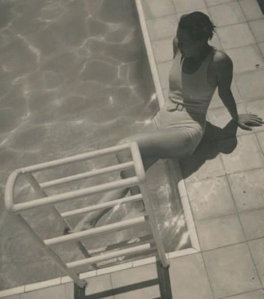 | Juliette assise au bord de la piscine, dans l'eau, villa de Reynaldo Luza, Formentor, Majorque, Baléares | |