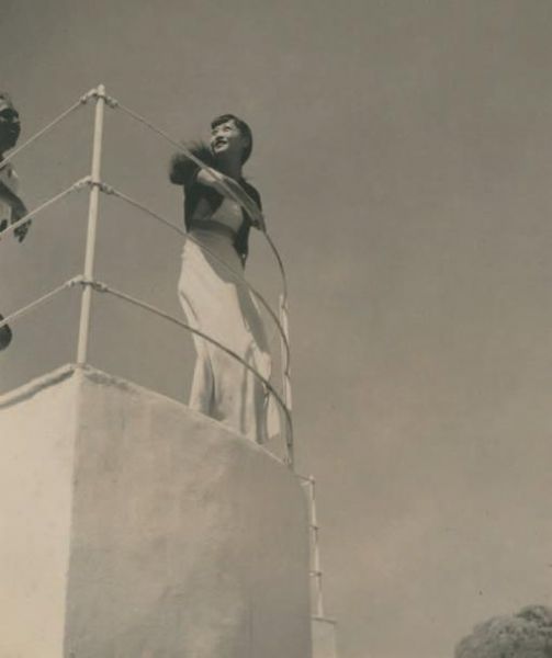| Madame Hui-Lan Oei Wellington-Koo, femme du diplomate chinois Vi Kyuin Wellington-Koo, sur la terrasse, villa de Reynaldo Luza, | |