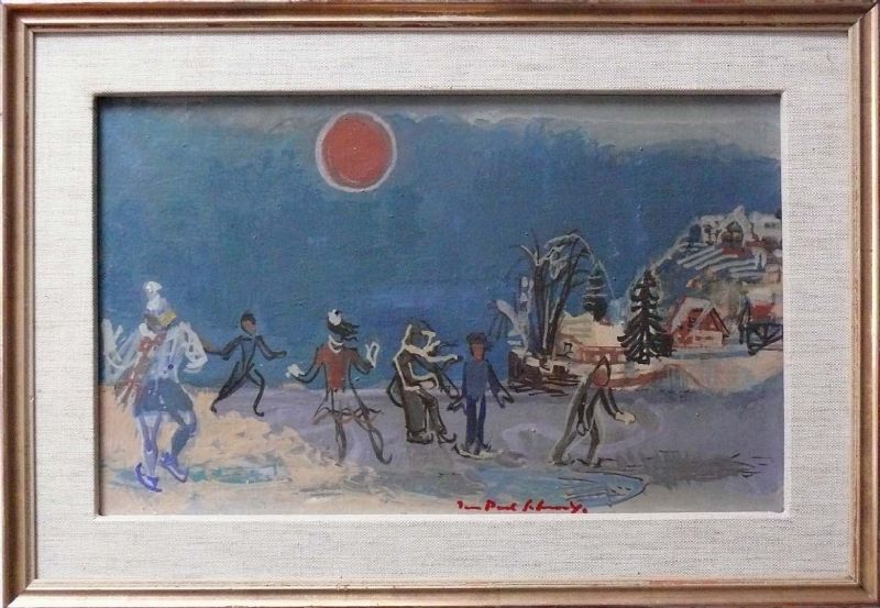 | ''Winterabend auf dem See''; mehrere Personen mit Schlittschuh auf zugefrorenem See vor Hörilandschaft | |