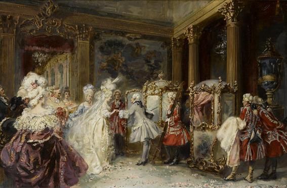 Elegant figures entering sedan chairs in an interior