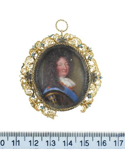 | Louis XIV of Bourbon (1638-1715), King of France (1643-1715), wearing armour, frilled white lace cravat, crimson ribbon and blue | |