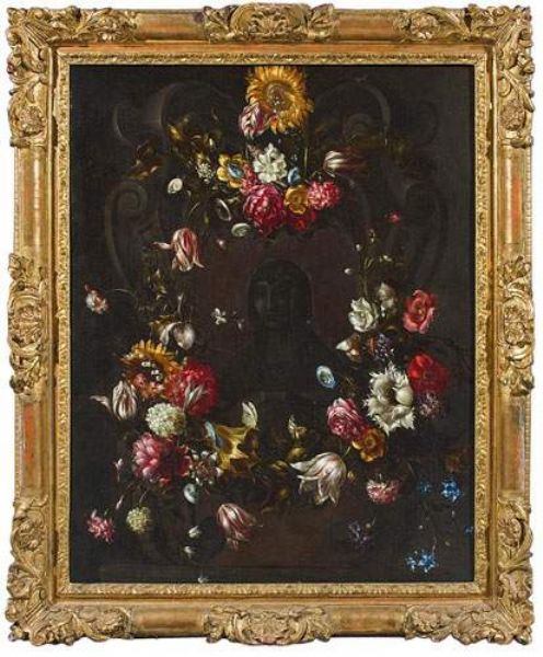| Guirlande de fleurs ornées de papillons avec au centre Ste Madeleine en buste inscrite dans un blason à enroulements. | |