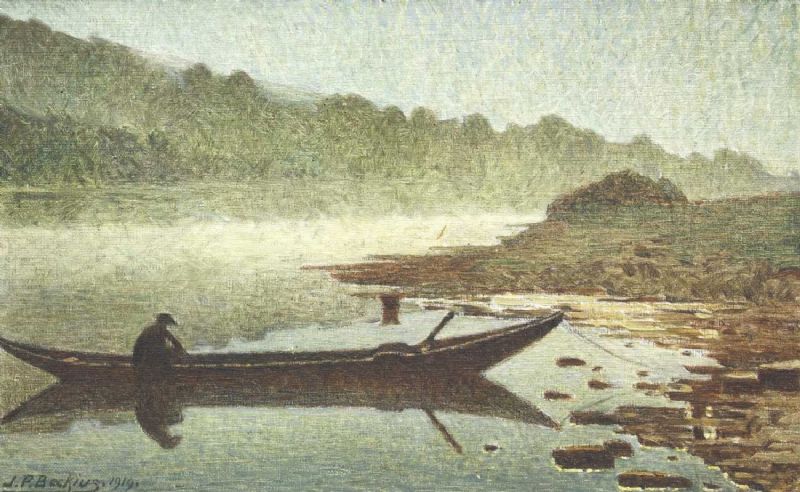 Flusslandschaft mit Mann in einem Kahn
