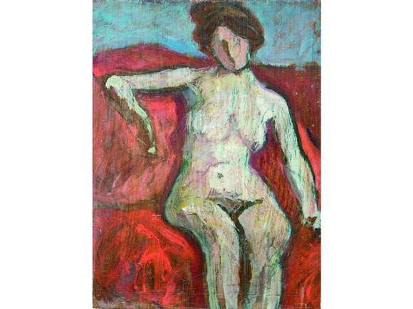 Nu assis dans un canapé rouge (à son atelier, octobre 1928)