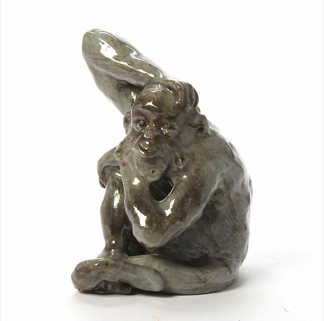| Stoneware sculpture in the shape of a sitting monkey decorated with grey glaze. | |