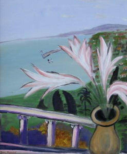 Südfranzösische Küstenlandschaft, Blick von einer Balustrade mit Blumenvase auf das Meer