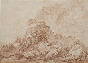 Une charrette embourbée devant un troupeau de moutons et entourée de paysans