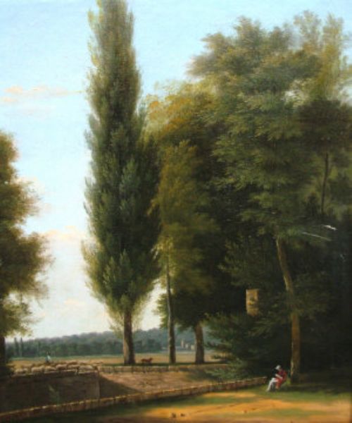 | Lady seated beneath trees by the edge of a field with a shepherd and his flock beyond | |