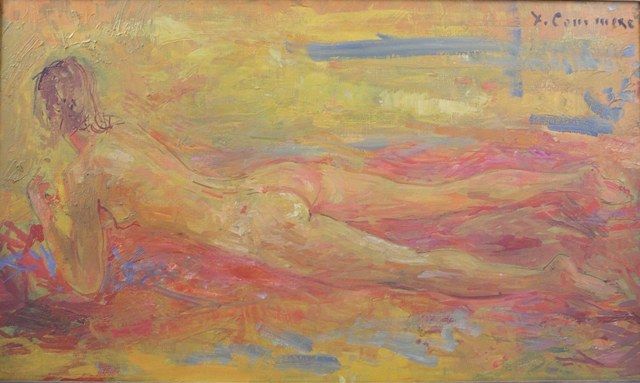Nude, a girl lying on her front, in bold yellow and red colouring