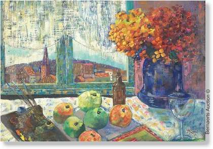 Nature morte aux pommes, bouquet de fleurs et chevalet de peintre avec ville à l'arrière-plan