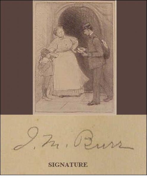 | A matronly woman and child in doorway receiving mail from postman | |