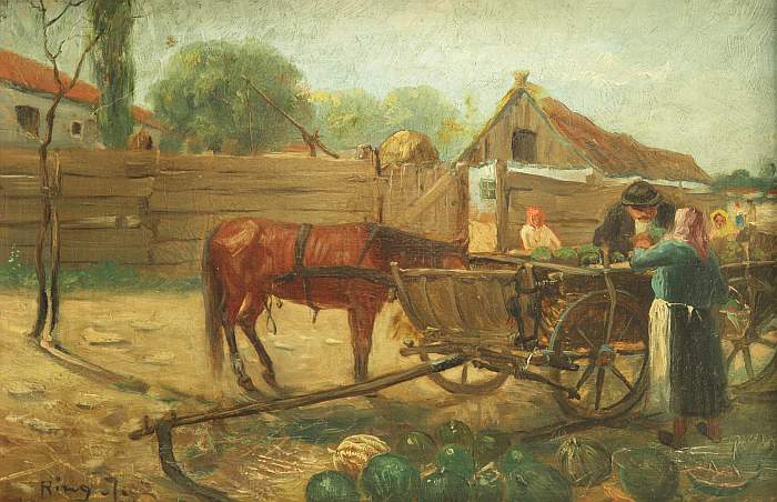 Zwei Melonenhändler vor Dorf in weiter Puszta-Landschaft