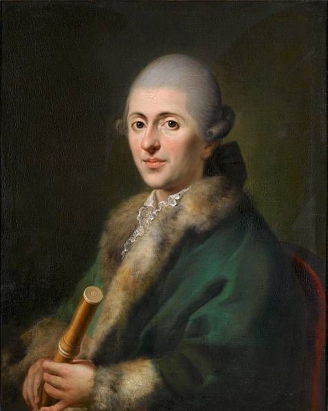 Portrait of a musician, half-length, in a green, fur-trimmed coat and holding a flute
