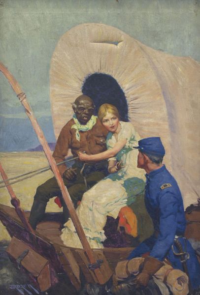 Western Scene With Negro Hand, Young White Female And Union Soldier On Horseback