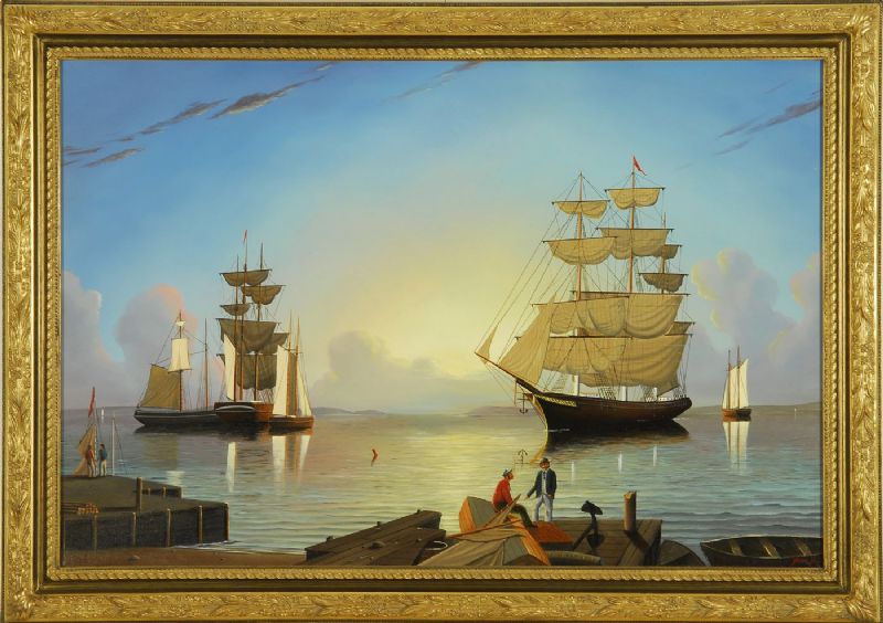 | Boston Harbor at sunrise with figures on the docks in the foreground and boats moored in the harbor | |