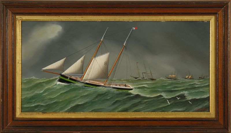 Pilot boat #8 with four ships in the background.