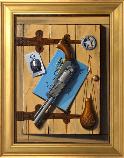Trompe l'oeil of a barn door with a Texas Ranger's badge