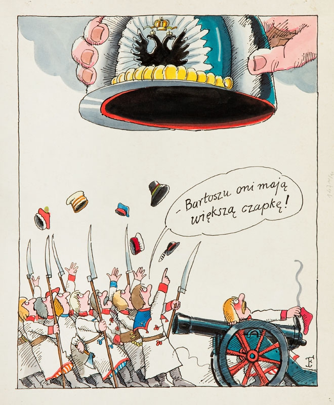 | " - Bartoszu they've got bigger hat!", satirical illustration | |