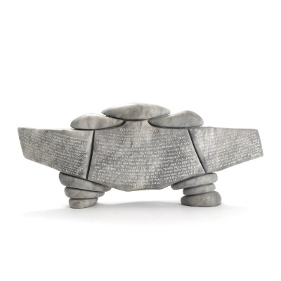 A polished grey marble sculpture inscribed with text by the philosopher David Spangler