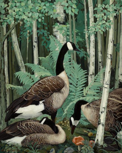 Wild geese in a birch wood