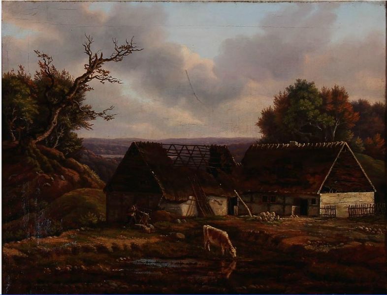 | Scene from the Danish moor with a farmer cutting firewood near a white farm. | |