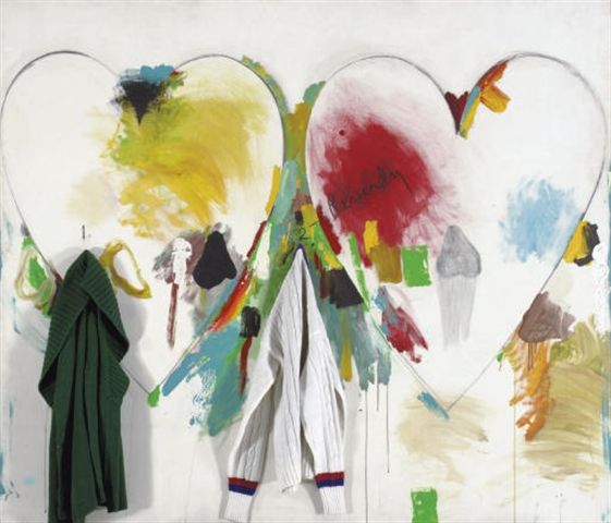 | Oil and charcoal with tennis sweater and golf cardigan on hooks on canvas | |