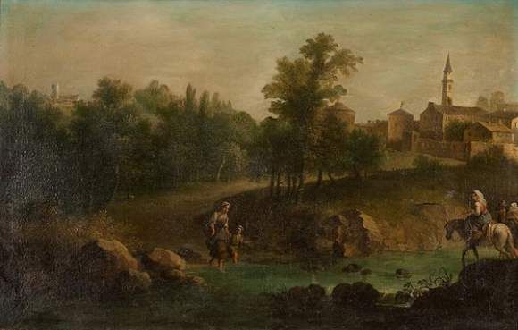 Landschaft mit Landvolk vor angrenzendem Dorf