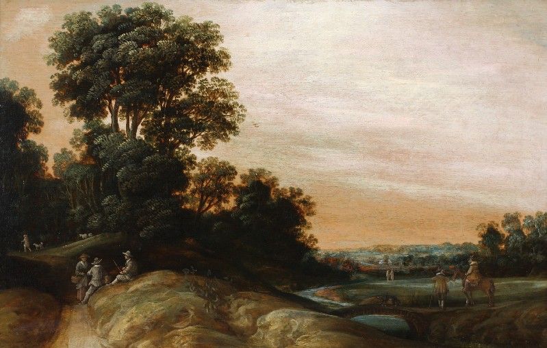 | A forest with travellers in a sandy lane and a man on horseback near a brook with a stone bridge | |