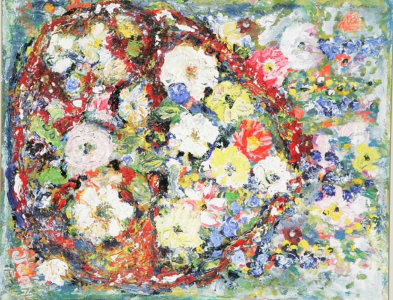 FLOWER BASKET, a mass of brightly coloured flowers