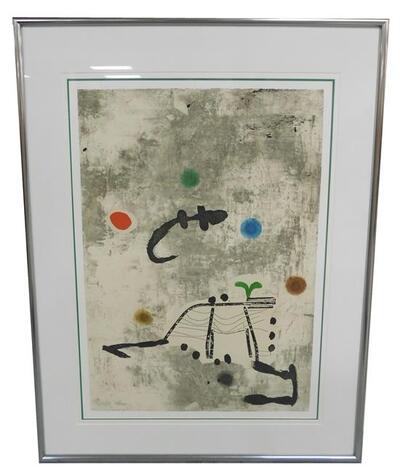 1979, aquatint and woodcut on paper, ed. 33/50 in pencil LR and pencil signed in image CR, published/printed by Maeght/Joan Barbarà, Barcelona,with full margins, floating mount, matted and framed with conservation glass, in silver tone frame with lit | |
