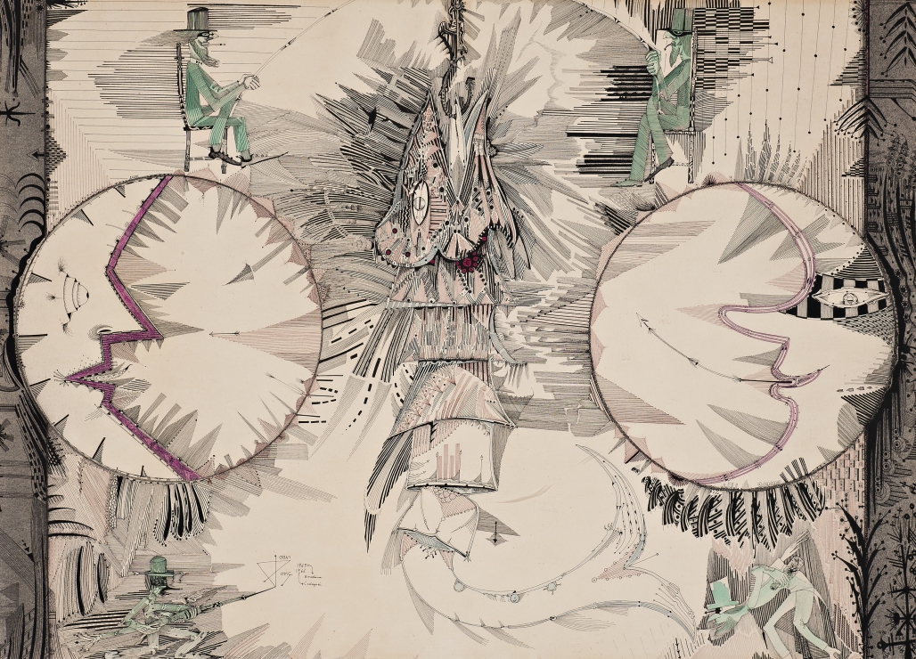 Ink and coloured pencil