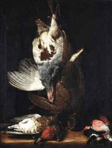 | A partridge and a pheasant suspended from a nail and various other birds on a wooden ledge | |