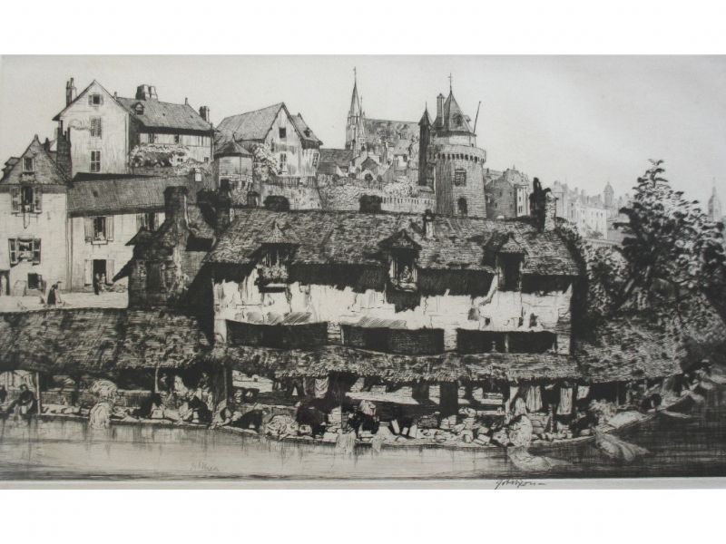 WASHERWOMEN BY A RIVER IN A FRENCH TOWN