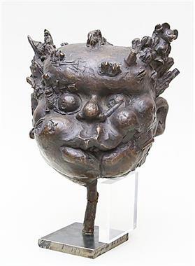 Skulptur eines Kopfes mit div. eingearbeiteten Elementen wie Schlüsseln, Patronen und kleinen Figuren