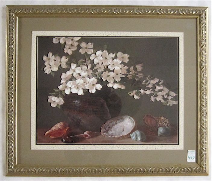 FLORAL STILL LIFE PRINT WITH DOGWOOD FLOWERS AND SHELLS,