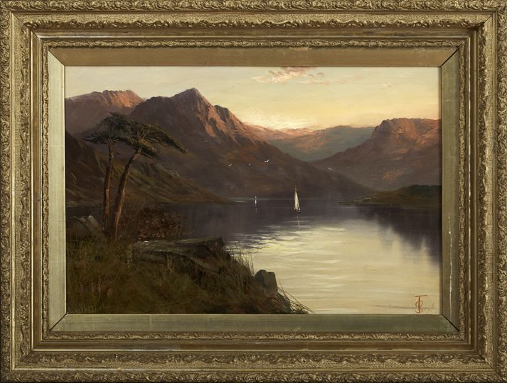Mountainous Landscape at Sunset with Sailboats on a Lake