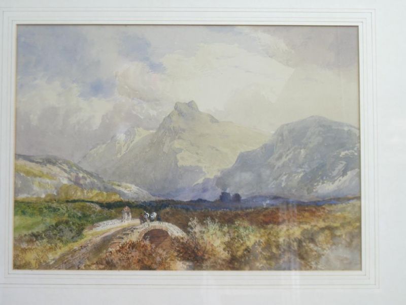 Figures crossing a Bridge, with distant mountains beyond
