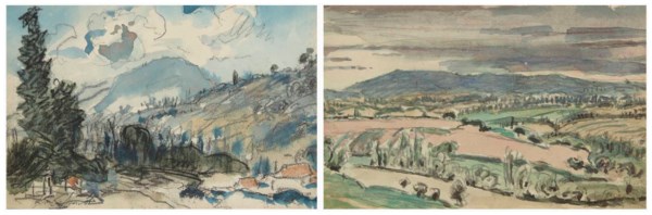 | Femme devant une maison à Chabons (recto), Paysage de bocage (verso); et Sapins dans la montagne (recto), Chute d'eau à Charbonn | |