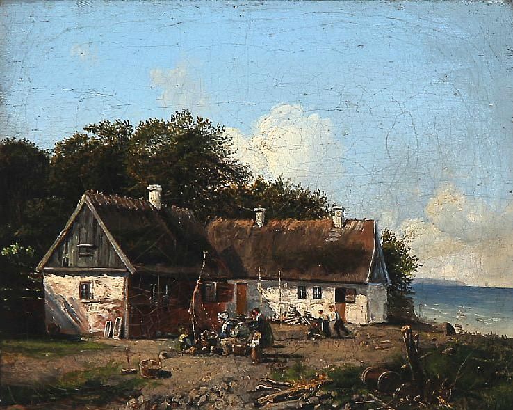 A thatched farmhouse near the water.