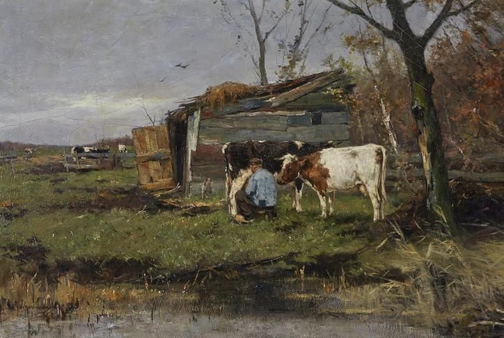 FARMER MILKING HIS THREE COWS BY AN OUTBUILDING