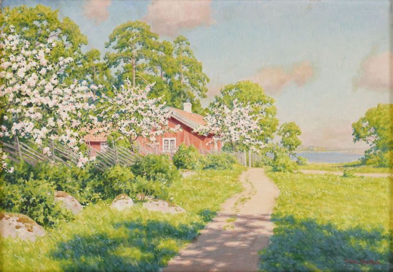| Försommardag med blommande fruktträd vid röd stuga | |