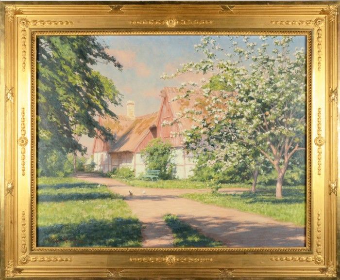 Korsvirkesgård med blommande fruktträd och pickande höns