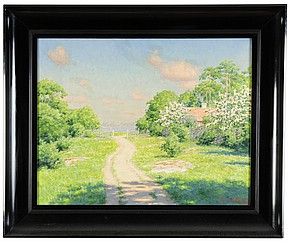 | solbelyst stig med röd stuga och blommande äppelträd | |