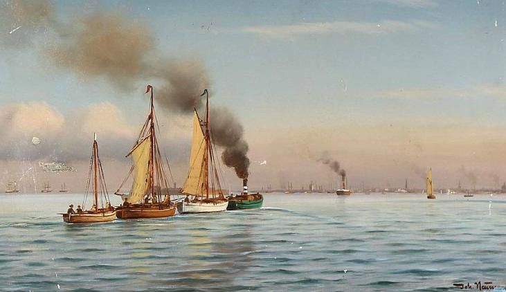 | Fiskerkvase bugseres til Kjøbenhavn. Seascape with sailing ships out shore Copenhagen | |