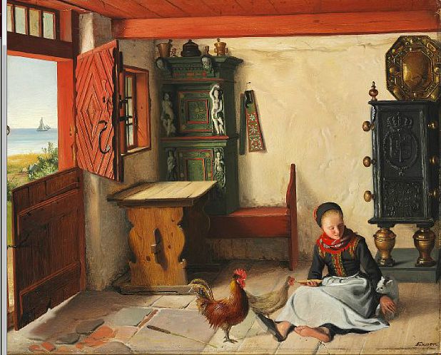 | Interior from Amager with a girl playing with a kitten. In the background a ship on Øresund | |